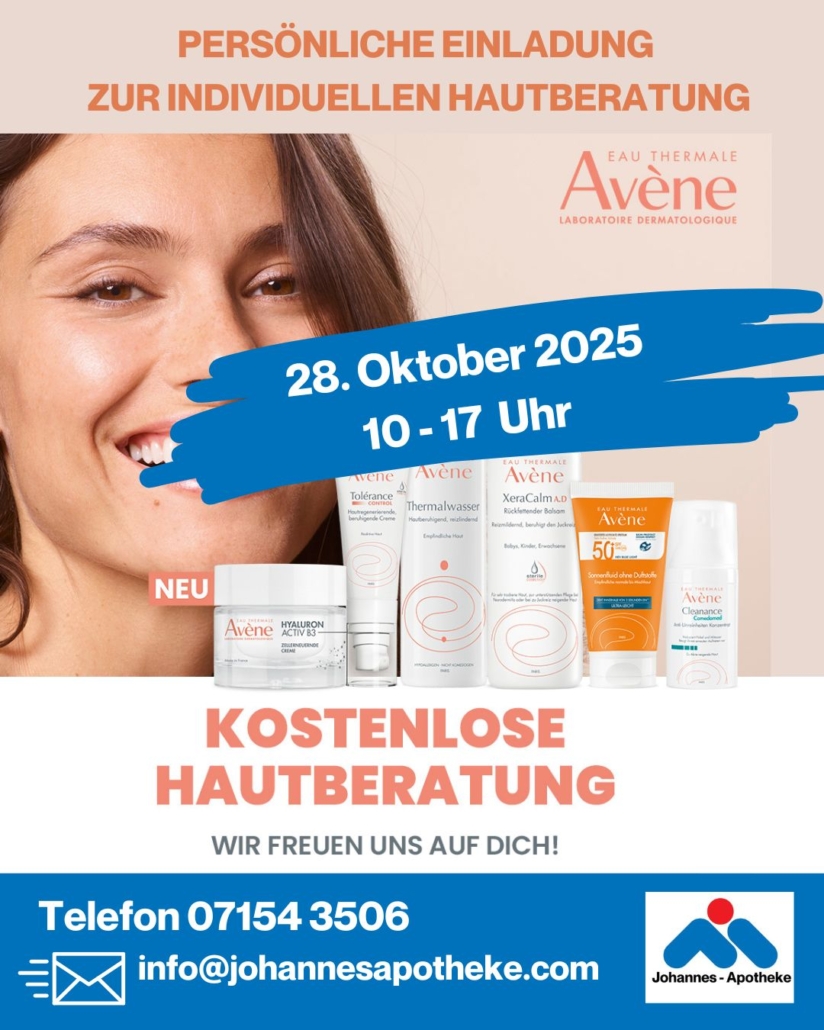 Entdecken Sie die Welt der Hautpflege mit AVÈNE! Am 28. Oktober laden wir Sie herzlich zu unserem exklusiven Hautberatungs-Tag in der Johannes Apotheke ein.