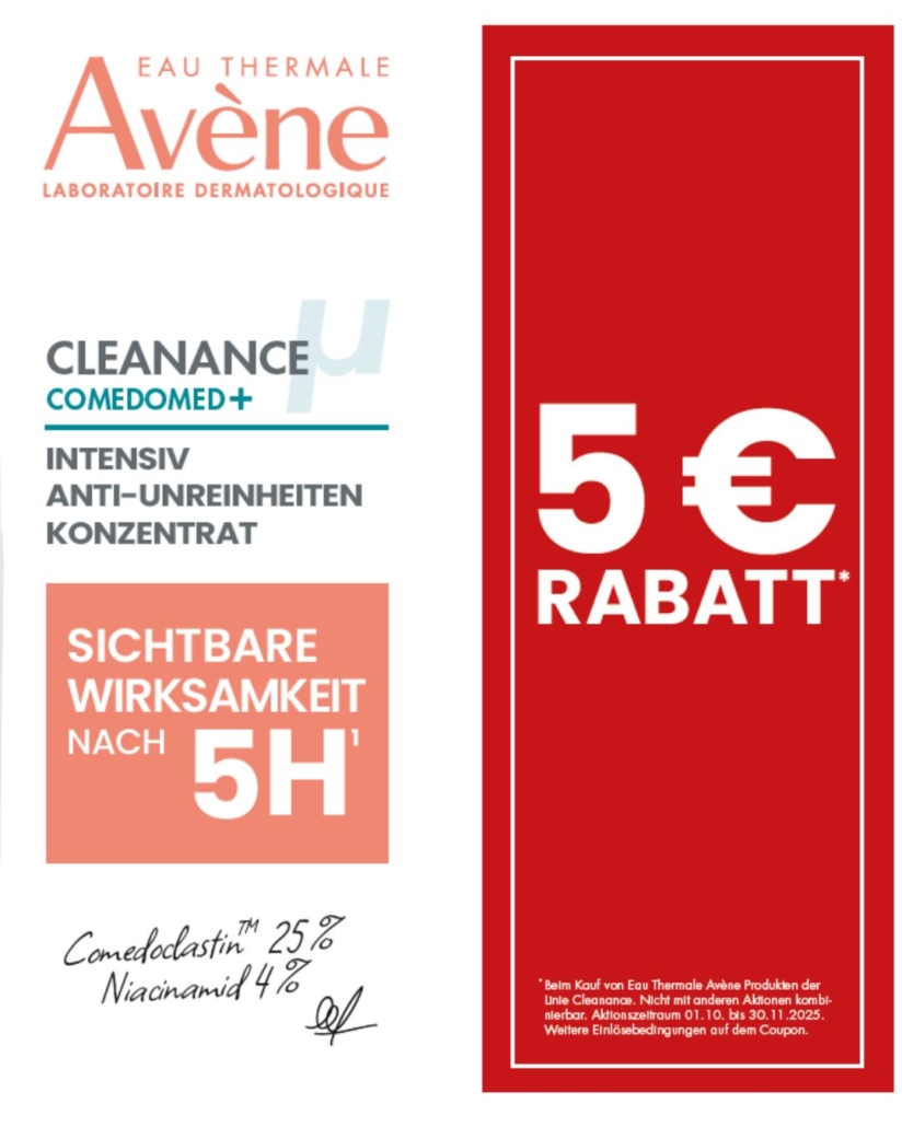 Beim Kauf von Eau Thermale Avène Produkten der Linie Cleanance. Nicht mit anderen Aktionen kombinierbar. Aktionszeitraum 01.10. bis 30.11.2025.