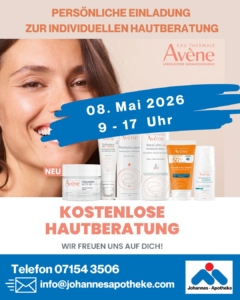 Entdecken Sie die Welt der Hautpflege mit AVÈNE! Am 8. Mai laden wir Sie herzlich zu unserem exklusiven Hautberatungs-Tag in der Johannes Apotheke ein.